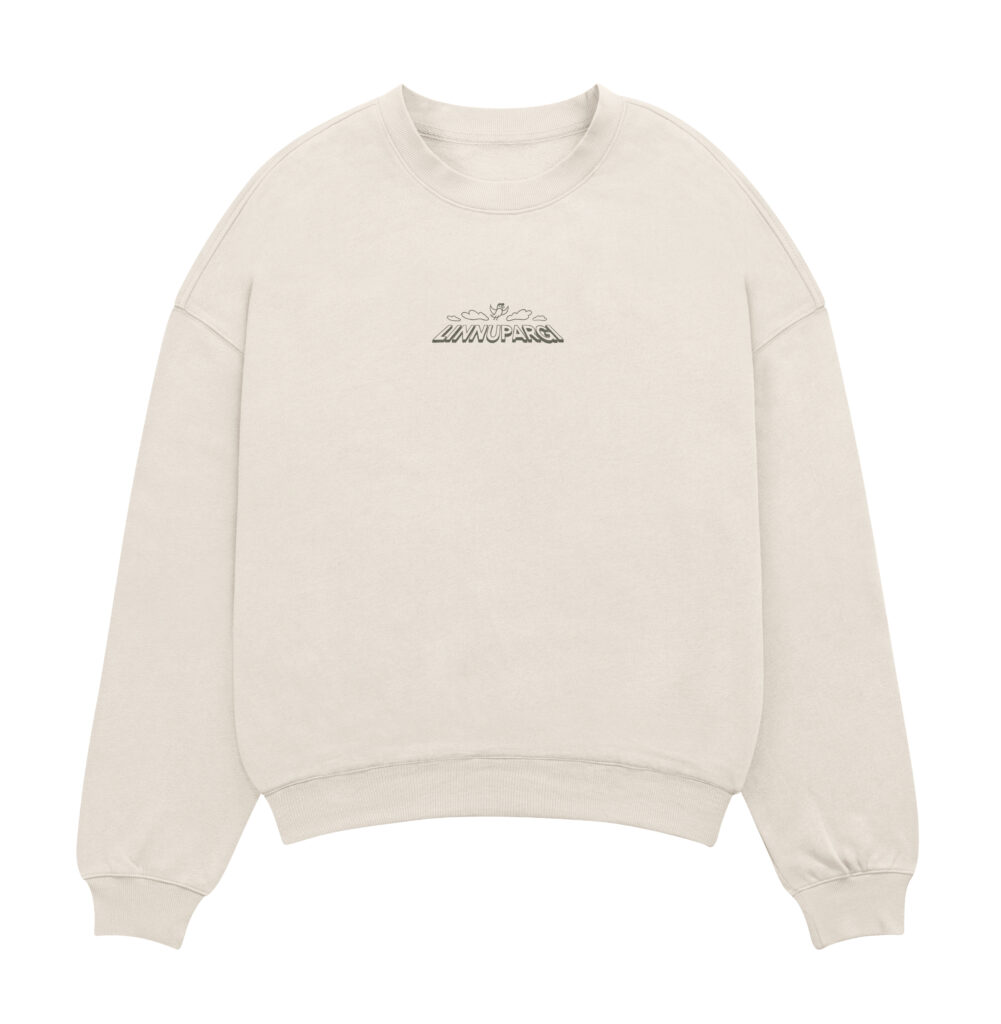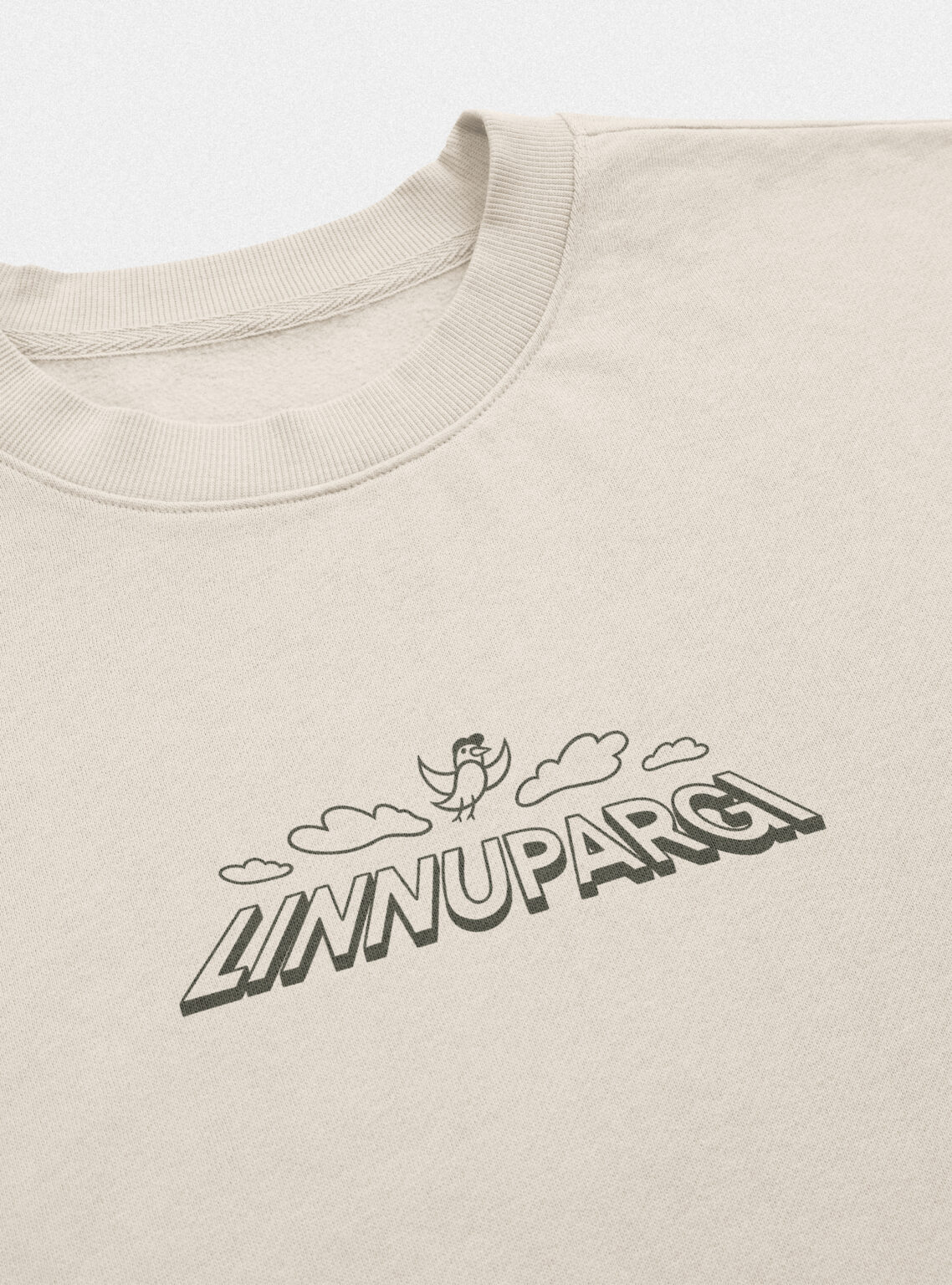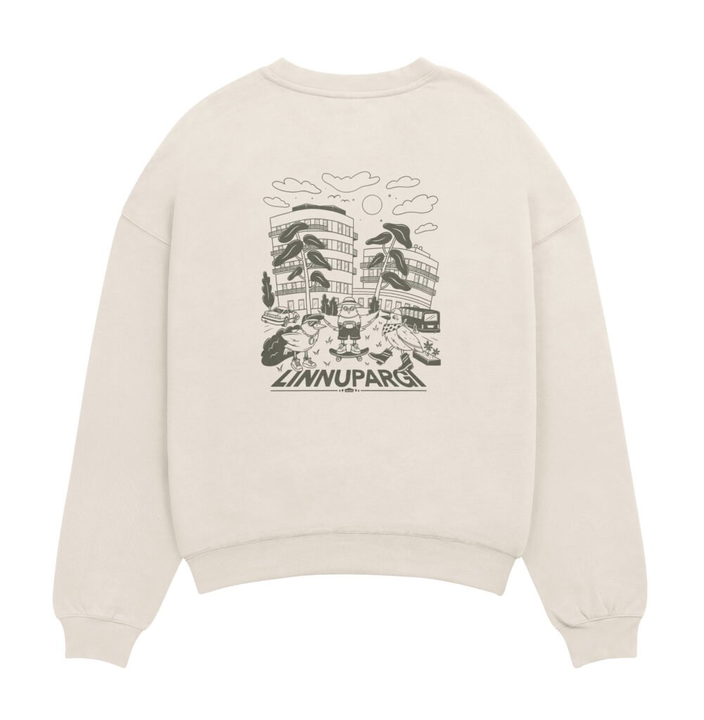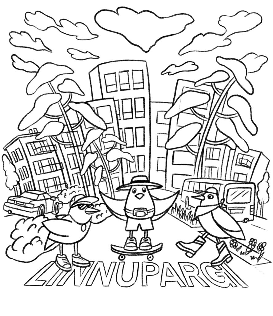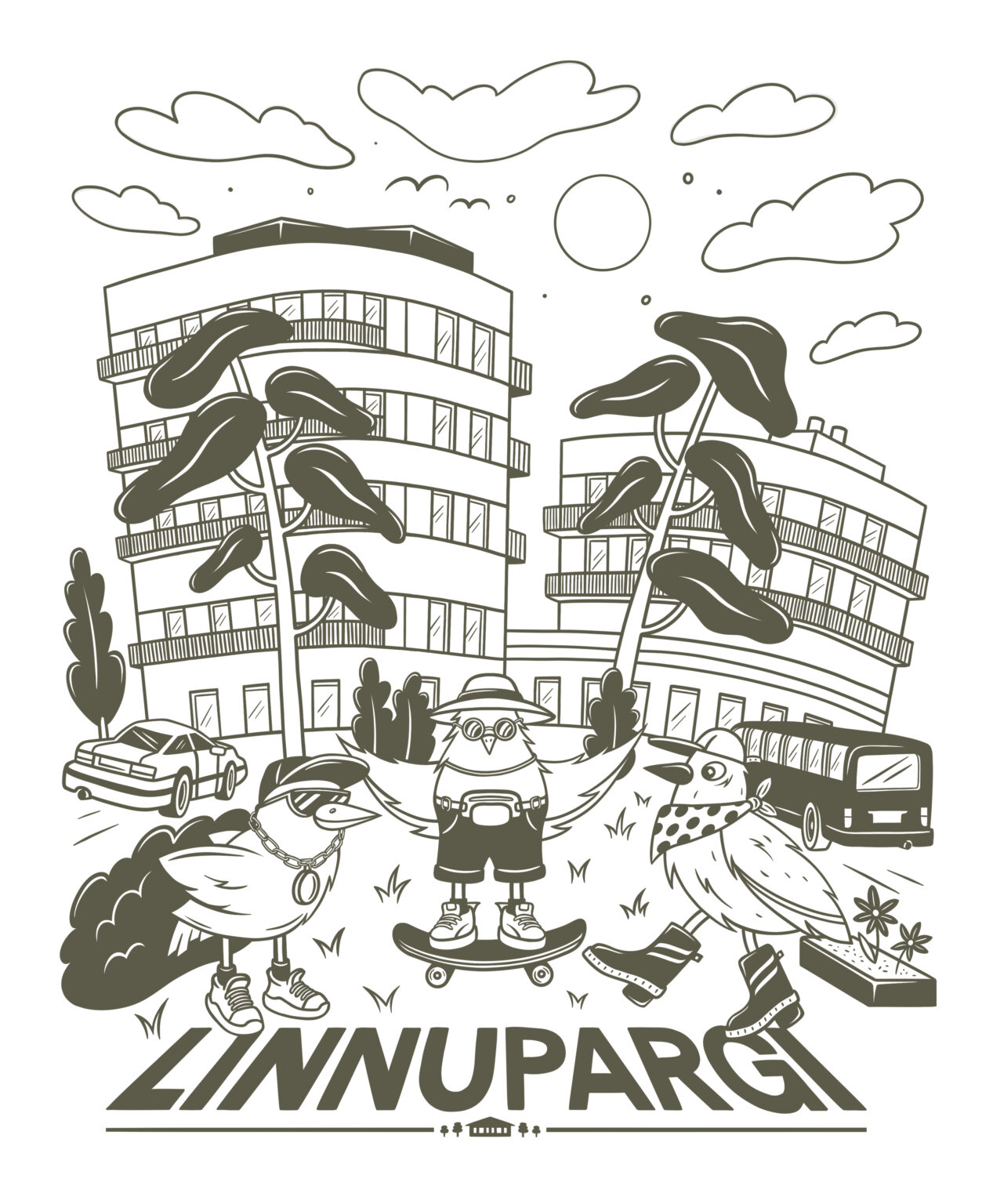 Three birds turned into local characters: sneakers, hats, skateboards and bags. The curved shapes of the real Linnupargi houses appear in the background, framed by tall trees and everyday details like cars and a bus.