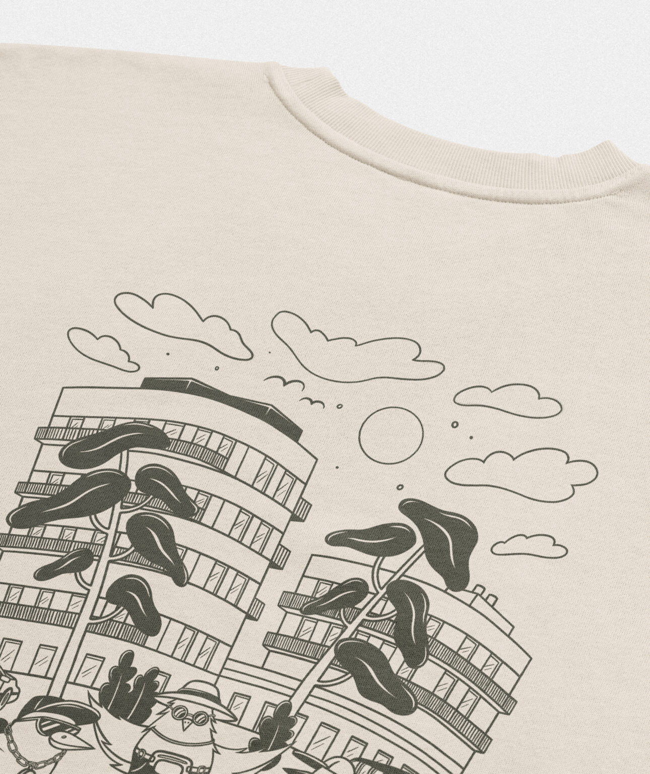 I started with two different illustration directions. Concept A – Calm cityscape. A cleaner, more traditional view of the buildings and park, with birds sitting around the area. Safe, minimal and close to classic architectural illustration. Concept B – Playful bird residents